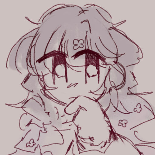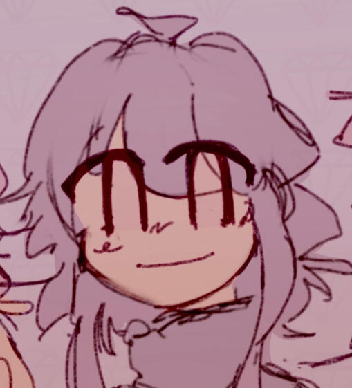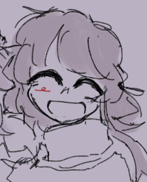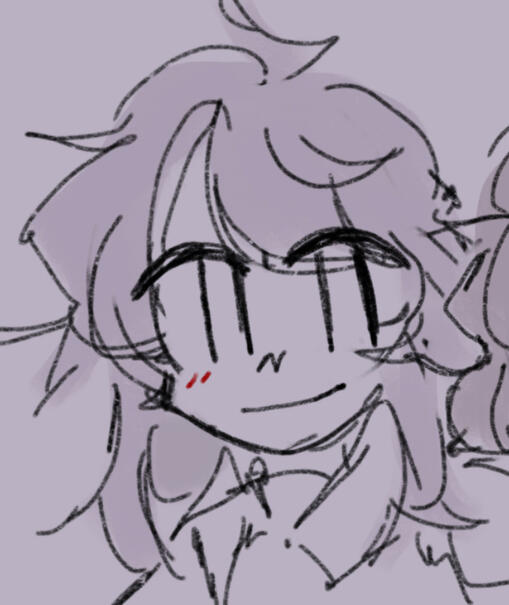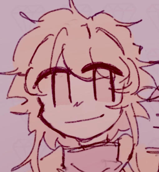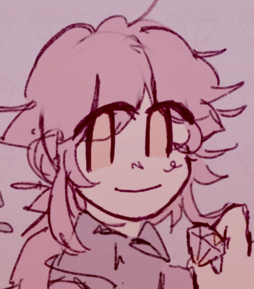 her hair is a really dark shade of pink, rarely seen tied up and is always messy. they wear a black turtleneck, along with a pink skirt and leggings.