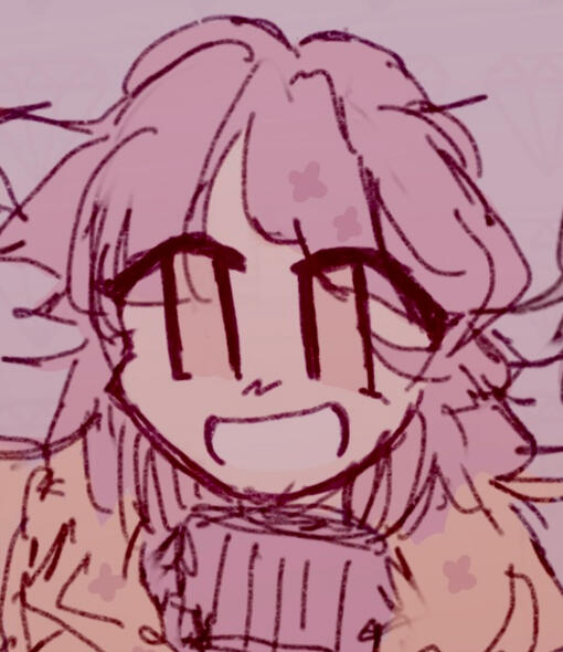 her hair is a really dark shade of pink, rarely seen tied up and is always messy. they wear a black turtleneck, along with a pink skirt and leggings.